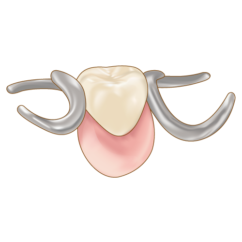一部の歯が失われた場合に使用する装置です。歯茎の役割をする床に人工歯を取り付け、残っている歯にバネ(クラスプ)を引っ掛けて固定します。部分入れ歯は、健康な歯をほとんど削る必要がなく、治療回数も少なく済みます。